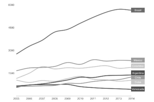Latinoamérica adquiere un papel protagónico en la nueva distribución científica; no obstante, la forma en que cada país se desenvuelve es particular. Ejemplo de ello es que algunos países muestran un comportamiento a la alza, mientras Venezuela muestra una crisis a partir de 2009.