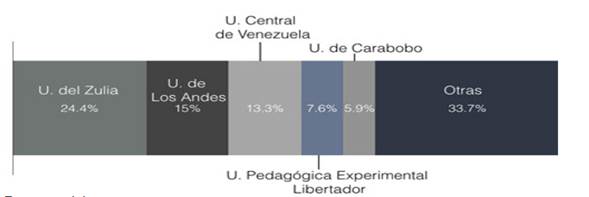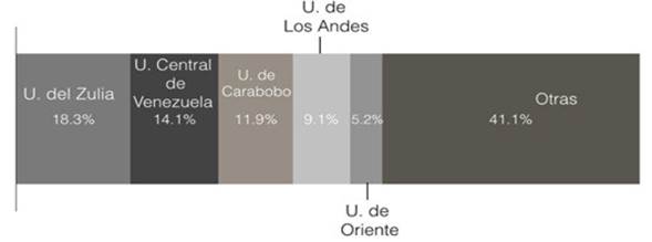 En el caso de las CSyH, de 254 instituciones que registran producción en el área, destacan 5, las que concentran el 66.2% del total de la producción científica: Universidad del Zulia, Universidad de Los Andes, Universidad Central de Venezuela, Universidad Pedagógica Experimental Libertador y Universidad de Carabobo, grafico 2.