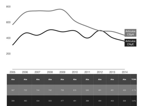 La producción de las CNyE muestra en general parámetros menos drásticos que las CSyH. Tienen una caída menos drástica, recuperándose en 2012, año a partir del cual se observa una caída que se mantiene hasta 2014. De tal forma, los artículos de esta área presentan una TCMA de 3.6%, sin embargo, destaca que también terminan 2014 con parámetros menores de los registrados en 2005.