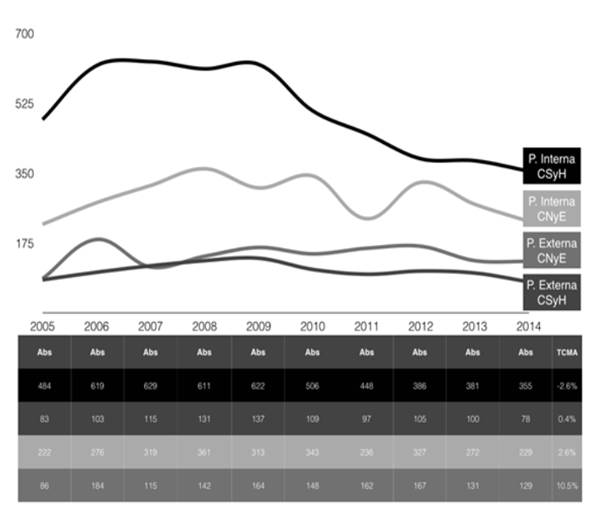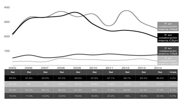 En el caso de las CSyH se tiene una colaboración con propensión al interior del país. Se observa, por ejemplo, que en 2005 este tipo de colaboración representaba el 91.9% de la producción colegiada y tal peso dominante se mantuvo estable hasta 2014, año en el que representó el 86.6%, lo que ayuda a explicar la caída interna y externa. En cambio, los artículos que registran colaboración con pares del extranjero se mantienen en un papel secundario respecto a los de autores nacionales, pero registran una TCMA más dinámica: 5.5%, lo que es una tendencia muy positiva, pero por el peso relativo, insuficiente para reducir el impacto de la crisis interna.