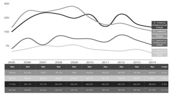 Se observa que el porcentaje de colaboración al interior de ambas áreas de conocimiento es diferente. En el caso de las CSyH, los investigadores tienden a colaborar más con colegas de su misma institución de adscripción, ejemplo de ello es que en 2005 la colaboración institucional representaba el 79.6% en el total de la producción realizada a partir de colaboración interna, y en 2014 el porcentaje permanece casi intacto: representa el 80.9%.
