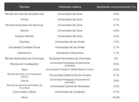 La misma concentración se observa poniendo en la mira a las entidades editoras. Las CSyH cuentan con producción en 354 revistas, sin embargo, 15 de éstas concentran el 54.0% del total de la producción en el área. Cabe señalar que tales revistas que concentran la producción de CSyH son todas venezolanas, aspecto que no se replica en las CNyE. Destaca que la Universidad de Los Andes y la Universidad Pedagógica Experimental Libertador editan cada una 2 revistas; la Universidad del Zulia, 5; mientras que la Asociación Interciencia, la Sociedad Venezolana de Oncología, la Universidad de Carabobo, la Universidad Central de Venezuela, la Universidad Privada Dr. Rafael Belloso Chacín y la Universidad Católica Cecilio Acosta editan solo una por institución, tabla 2.