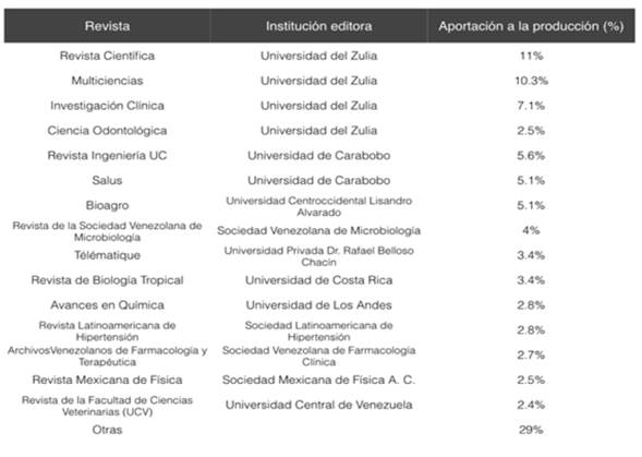 Por otra parte, las ciencias exactas registran producción en 205 revistas, no obstante, 15 de éstas concentran el 70.7% de la producción en el área. Cuatro son editadas por la Universidad del Zulia, dos por la Universidad de Carabobo; el resto son editadas por diferentes instituciones. De las 15 revistas que encabezan la producción, destacan 2 provenientes del extranjero: la Revista de Biología Tropical, editada por la Universidad de Costa Rica; y la Revista Mexicana de Física, de la Sociedad Mexicana de Física, A. C. Tabla ·3.
