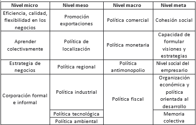En la teoría propuesta por el grupo de investigadores del Instituto Alemán del Desarrollo (Esser et al, 1996) se define la competitividad sustentada en la integración social, que propone a la vez reformas económicas junto con un proyecto de transformación de la sociedad, la que conceptualizan como competitividad sistémica. El concepto constituye un marco de referencia para los países tanto desarrollados como en vía de desarrollo. Establece dos elementos para determinar los factores de la competitividad industrial: la diferenciación entre cuatro niveles analíticos distintos (meta, macro, meso y micro) (Cuadro 1), y la vinculación de elementos pertenecientes a la economía industrial, a la teoría de la innovación y a la sociología industrial (Esser et al, 1996).