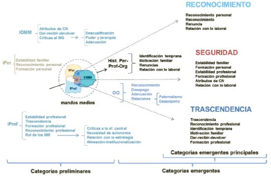Se encontraron y conceptualizaron tres componentes propios del proceso de construcción identitario, hallados a partir del análisis de los datos: reconocimiento, trascendencia y seguridad. Para ello, se recurrieron a las ciencias sociales, concretamente a la filosofía y a la antropología, en la búsqueda de un mayor entendimiento y alcance en el ámbito organizacional de tales conceptos; sobre todo, con respecto a las relaciones que generan y el sentido que tienen para los MM dentro del proceso de construcción identitario que adelantan.