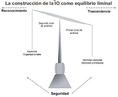 La balanza busca expresar el equilibrio entre los dos componentes mencionados: la identidad personal y profesional, y los aspectos organizacionales. La IO se sostiene por la seguridad que les otorga la organización a los individuos, en el proceso de construcción de una IO específica. Lo personal del individuo (la identidad personal y profesional) tiene una importancia mayor para él, de ahí que la balanza esté inclinada. Del otro lado se encuentran los aspectos organizacionales propios de la organización. Esta balanza, que busca estar en equilibrio y se va adecuando y reacomodando constantemente, se encuentra en un estado liminal, en una situación de no-estructuración. Es el communitas, caracterizado por las fuerzas contrarias de reconocimiento y trascendencia, que mirando al pasado y al futuro, respectivamente, delimitan un estado de construcción de sentido del individuo en donde no siendo, buscan definirse a sí mismos en relación con la organización.