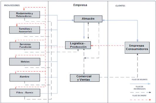 La cadena de suministros está conformada por los proveedores, la empresa y los clientes, esta inicia aguas arribas desde la recepción del requerimiento de los clientes del determinado bienes y servicios, petición que es realizada por medio magnético, por teléfono, o por medio de contacto con el área comercial la cual transmita la información a producción para que este coordine la recepción del servicio, pasando por las compras realizadas a los proveedores locales o nacionales para la prestación del servicio, hasta finalmente realizar la entrega final del mismo, los cuales son transportados mediante vehículos propios de la empresa. En el Diagrama 2 se puede evidenciar el alcance de la cadena de suministros de la empresa caso estudio.
