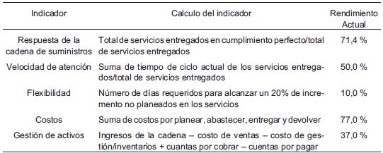 Para la medición de estos indicadores, hay que tener en cuenta que, según la Supply Chain Council (2010), (i) La fiabilidad, mide el desempeño de la cadena de suministros en el proceso de entrega de repuestos, articulo o producto correcto, en condiciones aptas, con la calidad requerida, con la documentación e información pertinente. (ii) La velocidad de atención, se refiere a la velocidad con la cual la cadena de suministros provee productos a clientes tanto internos como externos, para ello, miden el tiempo empleado de una tarea particular dentro de la cadena de suministros desde que se inicia la actividad hasta que finaliza. (iii) La flexibilidad, hace referencia a la agilidad de la cadena de suministros ante cambio en el mercado, con el propósito de mantener o ganar ventajas competitivas. (iv) Los costos, hace referencia a los costos asociados a la operación y gestión de la cadena de suministros. (v) la gestión de activos, miden la efectividad financiera de la cadena de suministros, el manejo que se le da a los activos fijos o al capital de trabajo (Cuadro 6).
