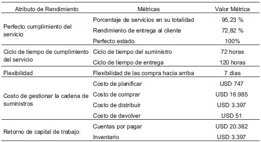 Los indicadores (performance metrics) del segundo nivel, de igual forma contemplan los atributos del modelo SCOR, como son: fiabilidad en el cumplimiento, capacidad de respuesta, agilidad, costos, y manejo de activos. Permitiendo realizar un diagnóstico a las métricas del primer nivel, y ayudando a identificar errores o vacíos presentados con anterioridad. En el Cuadro 8 se evidencia la medición de los indicadores en la cadena de suministros de la empresa, teniendo en cuenta atributos de rendimiento como: (i) Perfecto cumplimiento del servicio, (ii) Ciclo de tiempo de cumplimiento del servicio, (iii) Flexibilidad, (iv) Costo de gestionar la cadena de suministros y (v) Retorno de capital de trabajo. Dado que los atributos no pueden ser medidos, las métricas son usadas para calcular el rendimiento que cada uno de estos, y así definir una estrategia para su óptima operación. Esos se calculan teniendo en cuenta los cálculos métricos del Cuadro 8.