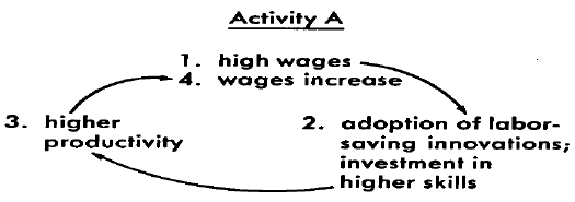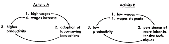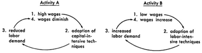 Por el contrario, en la actividad B (donde los salarios son bajos), las técnicas de producción preferidas son aquellas intensivas en mano de obra, dejando un terreno baldío para la generación de innovaciones que utilicen la mecanización y automatización en los proceso de producción, y de esta forma la productividad laboral y el avance tecnológico permanecen estancados.