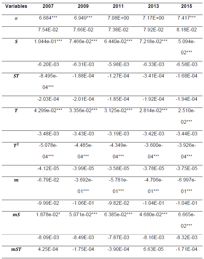 Al igual que para Neuman y Weiss (1995), para este estudio la variable experiencia por escolaridad ( ) es fundamental ya que muestra como el ingreso cambia ante aumentos en la experiencia y en la escolaridad, por tanto si reporta un valor negativo, estadísticamente significativo (p<0.05) entonces sugiere que hay un efecto negativo de los niveles de cualificación más altos sobre los ingresos cuando aumenta la experiencia laboral lo que refleja depreciación del capital humano generada por un cambio social drástico, como lo es el cambio técnico; en caso contrario, si reporta un valor estadísticamente no significativo (negativo o positivo), significa que el efecto de la retroalimentación positiva del capital humano contrarresta el efecto del cambio técnico sobre capital humano.