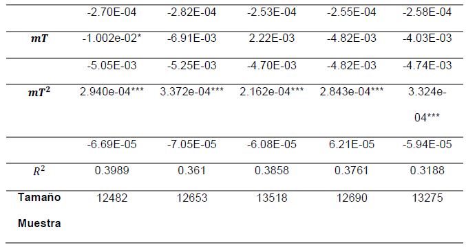 El coeficiente de determinación (R2) para todos los periodos, en promedio, fue de 0.368. Es un resultado cercano a los reportados en otras investigaciones: Murillo, I. P. (2006) reporta un coeficiente de 0.4557; Raymond y Roig (2004) y Martínez Gutiérrez (2012) para diferentes actividades económicas, en promedio, 0.338 y 0.483, respectivamente. Para aumentar la calidad del ajuste del modelo, en futuras investigaciones, es menester adicionar variables dummies asociadas a la jefatura del hogar y rama de actividad económica y/o utilizar modelos no lineales.