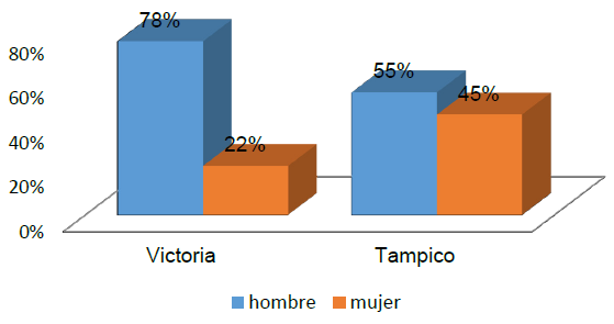En cuanto al género de los directivos de las empresas, se pudo observar que en Cd. Victoria existe una diferencia notable entre la dirección del negocio; el 78% de los encuestados son hombres, mientras que solo un 22% está representado por mujeres. En el caso de Tampico se nota una mayor homogeneidad en la distribución de la dirección, siendo el 55% de los negocios encuestados dirigidos por hombres y el 45% dirigido por mujeres.