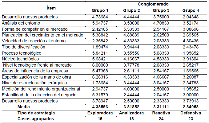 Por lo anterior, en la tabla 1, y a partir de las medias de cada conglomerado se definió el tipo de estrategia, resultando el grupo 1 con una media de 4.38 siendo la más alta de los cuatro grupos, por lo que corresponde a la estrategia exploradora, el grupo 2 con una media de 3.81 describe a la estrategia analizadora, en tanto que el grupo 3 y 4 con medias de 3.31 y 2.84 reflejan a la estrategia reactiva y defensiva respectivamente.