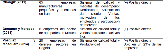 Son diversos los estudios antecedentes que han comprobado la existencia del aseguramiento de la calidad y competitividad en empresas de diversos tamaños y sectores, a continuación, se presenta el cuadro 1 donde se resumen los principales estudios empíricos sobre este tema.