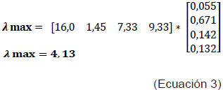 Donde landa máximo (λmax) se determina de una forma sencilla si se conocen los valores totales normalizados y los pesos o ponderaciones de cada criterio.