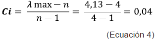 Índice de consistencia (CI): Consiste en la formula anteriormente planteada teniendo en cuenta que el valor de n equivale a cuatro (4) criterios: