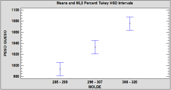 A partir de esto se hace un análisis de gráficas por medio del software Statgraphics Centurión XVII, para comparar los diferentes niveles de los factores con respecto a la variable que se esté analizando. Los resultados obtenidos indican que el peso del molde en el nivel uno de 285 gramos a 295 gramos, brindan mejores respuestas a la variable de interés en este caso el peso del producto final (Gráfica 9).