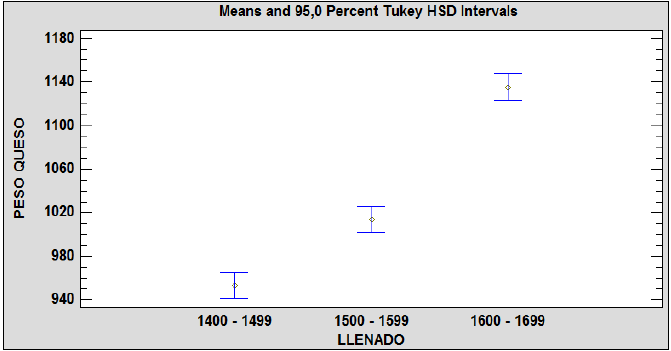 De igual forma se hizo el análisis teniendo en cuenta el factor de nivel de llenado, donde los resultados obtenidos indican que el peso del molde en el nivel dos entre 1500 gramos a 1599 gramos presentan resultados favorables con respecto a la tolerancia permitida en la variable peso del producto (Gráfica 10).