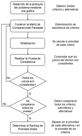 Esta técnica permite obtener una opción entre diferentes alternativas analizadas en base a criterios, variables y términos que normalmente se encuentran en conflicto (Saaty, 1980), el método consiste en los siguientes pasos: (i) Obtener las diferentes y posibles alternativas para realizar la decisión, (ii) Especificar los criterios utilizado para hacer la selección, (iii) Hacer las comparaciones pareadas mediante una matriz para determinar las prioridades, (iv) Comprobar por medio de pruebas la consistencia de los juicios del decisor y (v) Establecer las prioridades totales asociadas a cada alternativa. De igual forma Ho et al, (2006), en su investigación estructuran en forma de diagrama de flujo, las etapas generales se pueden concretar en una serie de pasos, para poder llevar a cabo dicha metodología (Gráfica 1).