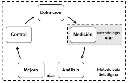Dado lo anterior, se tomó como referente solamente la fase de medición de la metodología Seis Sigma, para poder integrar la técnica AHP, por lo que es en donde se presenta un escenario habilitador, que de acuerdo con Brue (2002), en esta etapa se hace necesario identificar cuál es la característica que determina el comportamiento del proceso. Incorporando dentro de esta la técnica AHP, se hace posible poder tomar la mejor decisión ante un abanico de criterios y de alternativas.