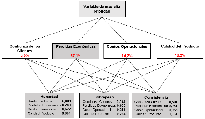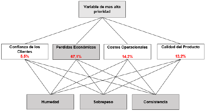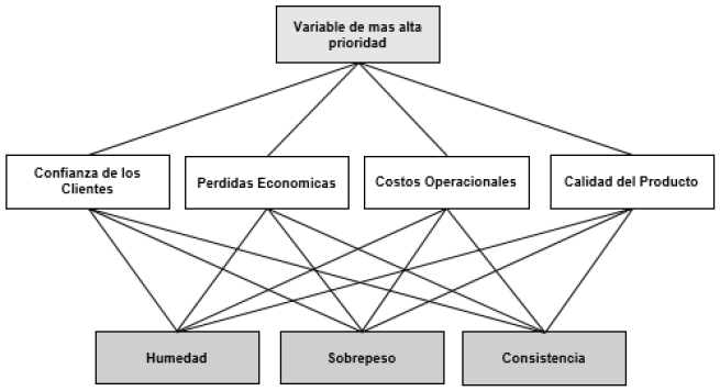 (iii) Alternativas: El sobrepeso, la humedad y la consistencia. Una vez identificados estos tres elementos, se procede a desarrollar gráficamente la jerarquización, tal como se muestra en la gráfica 4.