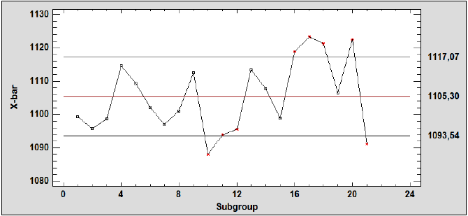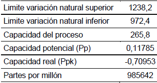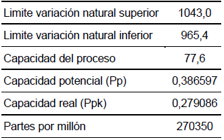Consecuente a esto se procede a realizar un estudio más profundo, teniendo en cuenta la evaluación de capacidad del proceso, considerando los parámetros estadísticos: (i) Tamaño de la muestra equivalente a 117, (ii) Número de muestras igual a 21, (iii) Media total (x) de 1105 gramos, (iv) Desviación estándar (s) igual a 44,29 gramos y (v) una tolerancia ideal de 1000 gramos ± 15.