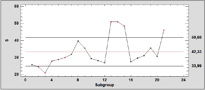 A su vez en la carta S, de igual forma existen 6 puntos de 21 totales están fuera de los límites de control (Gráfica 8). Complementariamente a esta situación en ambos casos se pueden observar que existen puntos o rachas que generan violaciones que a menudo son útiles para detectar procesos que se están alejando lentamente del valor meta, aun cuando ningún punto caiga fuera de los límites de control. De acuerdo al análisis anterior se puede declarar que el proceso está fuera de control con un nivel de confianza del 95%.