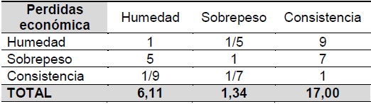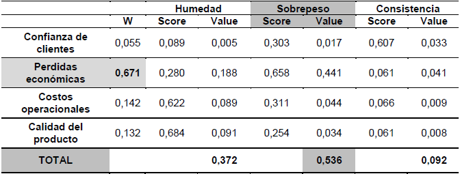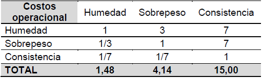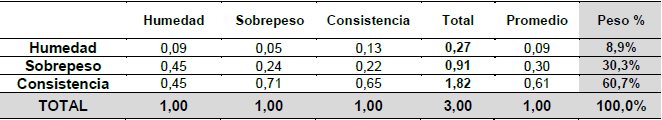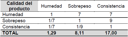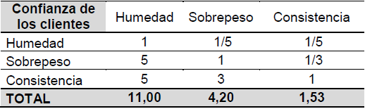 En la tabla 4 se puede apreciar la comparación del criterio de confianza de los clientes con respecto a las alternativas de humedad, sobrepeso y consistencia, para esto se realiza la sumatoria de todas las puntuaciones de forma vertical, cabe resaltar que esta matriz sirve de insumo para la toma de decisiones del siguiente proceso.
