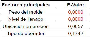 En esta fase se identifican los factores que influyen de manera significativa en las características asociada con la variable respuesta “peso del producto”. Una vez realizado estudios previos, se determinó que los factores corresponden a: (i) Peso del molde, (ii) Nivel de llenado, (iii) Ubicación en la prensa y (iv) Tipo de operador en empaque. Seguidamente, se utilizó la técnica diseño de experimentos para determinar el nivel de significancia que tienen los factores por medio de un análisis de varianzas o tabla de anova. En la tabla 11, se puede apreciar que los factores peso del molde y el nivel de llenado, presentan un p-valor igual a cero (0), siendo esta menor que 0,05; por lo que se rechaza la hipótesis nula, por tanto se puede inferir que estos dos factores influyen significativamente sobre los requisitos del cliente de la variable peso del producto.