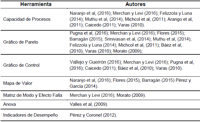 De acuerdo con Moreano y Cáceres (2010), dentro de las herramientas más comunes se encuentran casi todas las desarrolladas por calidad total, como son: (i) Procesos de mejora continua, (ii) Diseño de procesos, (iii) Análisis de varianza, (iv) La voz del cliente, (vi) Pensamiento creativo, (vii) Diseño de experimentos, (viii) Gerencia de procesos, (ix) Control estadístico de procesos.