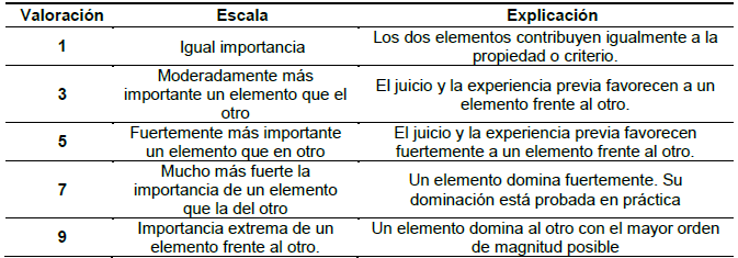 En esta etapa se realiza la evaluación del modelo jerárquico, donde se toman cada uno de los criterios y se confrontan uno con otros, de acuerdo con Saaty (1980), cuando se realizan comparaciones relativas, se debe considerar un rango de valores entre 1 y 9 (Cuadro 3).