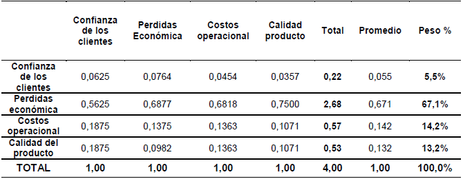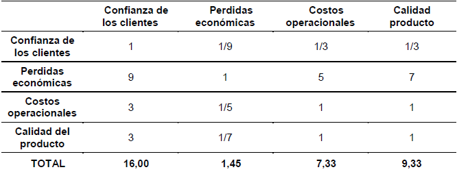 La matriz de comparaciones pareadas, quedaría representada tal como se estable en la tabla 1.
