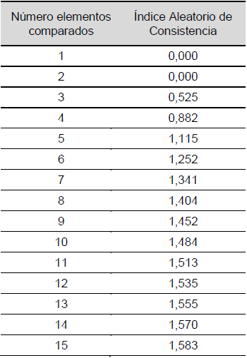 El índice de consistencia aleatorio (RI) se define como el índice de consistencia aleatorio medio obtenido mediante la simulación de 100.000 matrices recíprocas generadas aleatoriamente utilizando la escala de Saaty. En la tabla 3 se puede evidenciar que RI depende del número de elementos que se comparan.