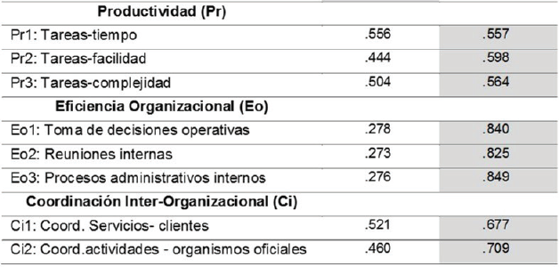 Para identificar las dimensiones del desempeño favorecidas por el uso de las TI, se utilizó el método de componentes principales y la rotación Varimax. Los resultados mostraron que el índice de adecuación muestral fue muy adecuado (KMO) con un valor de .902 y el test de esfericidad de Barlett resultó significativamente alto con un p-value de .001. De igual forma el análisis factorial implicó la existencia de dos factores que explicaban el 72.11% de la varianza. La Tabla 2 presenta la integración de los dos factores del desempeño organizacional.