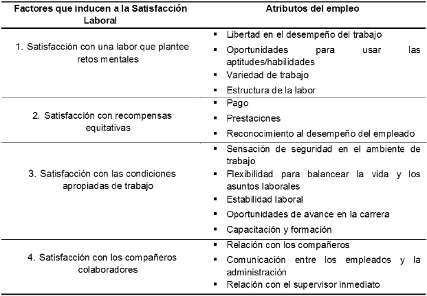 Robbins y Judge (2009), cuyos aportes desglosan cada uno de los componentes de la satisfacción laboral, exponen cuatro factores que conducen a lograr altos niveles, a cada uno de los cuales se les ha asignado ciertos atributos que los mismos autores han identificado como propios del empleo. Entonces, para lograr una alta satisfacción de los empleados, se debe abarcar cada una de las características inherentes al desempeño de la labor, para que de esta forma, se produzcan sentimientos completos de satisfacción (cuadro 1).