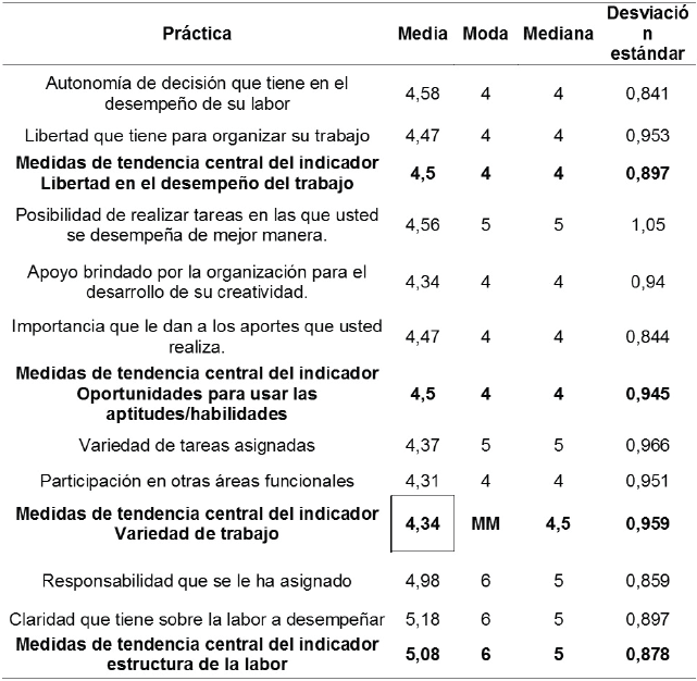 Respecto a los medianos niveles de satisfacción relacionados con el indicador sobre la variedad de trabajo, perteneciente al primer factor establecido por Robbins y Judge (2009), en las pyme objeto de estudio, encuentran su sustento en la falta de diversidad de las tareas que le son asignadas a los trabajadores, y por la poca participación que ellos tienen en otras áreas funcionales, es decir, la organización los limita a que sólo realicen aportes en lo que compete al desarrollo de su labor (tabla 1).