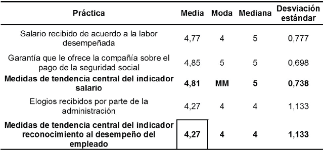 Por otro lado, en lo concerniente al indicador de reconocimiento al desempeño del empleado, ubicado en el segundo factor, sobre las recompensas equitativas, fue medido a través de los elogios que los trabajadores merecedores reciben por parte de la organización. Allí se evidenció que los encuestados no están totalmente satisfechos con los reconocimientos que se les otorga al cumplir con los objetivos trazados (tabla 2).