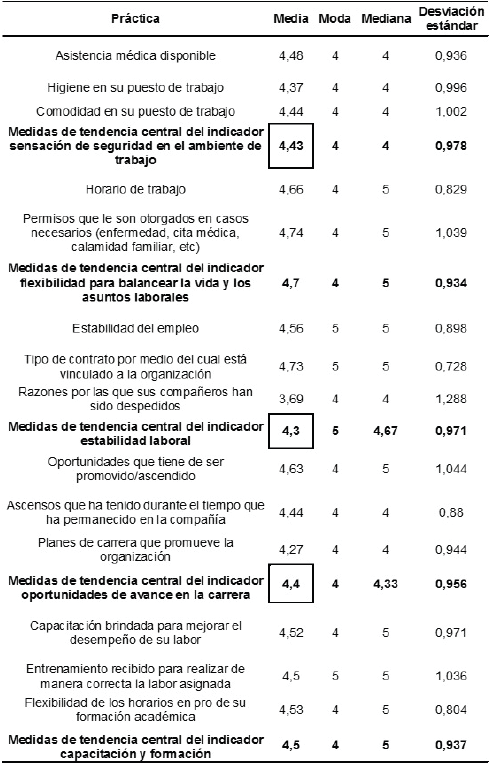 Otros de indicadores en los que se detectó una baja satisfacción de los trabajadores fueron los relacionados con la sensación de seguridad en el ambiente de trabajo, estabilidad laboral, y oportunidades de avance en la carrera, incluidos en el tercer factor para lograr la satisfacción laboral, sobre las condiciones apropiadas de trabajo (tabla 3).