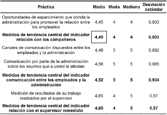 Por último, en lo que respecta a los indicadores contenidos en el último factor, se evidenció una debilidad en cuanto a la relación entre empleados, teniendo en cuenta que las organizaciones no brindan las suficientes oportunidades de esparcimiento con el fin de promover espacios propicios, donde los lazos de compañerismo entre empleados se fortalezcan (tabla 4).