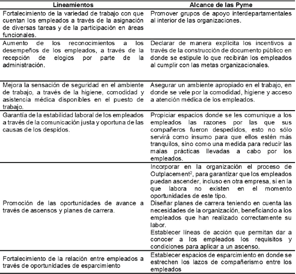 Teniendo en cuenta los resultados arrojados por el trabajo de campo realizado, se establecieron una serie delineamientos para lograr una mejora en la satisfacción laboral de los empleados de las pyme abordadas; para ello se tomaron aquellos indicadores cuya media se encontraba por debajo de 4.5.