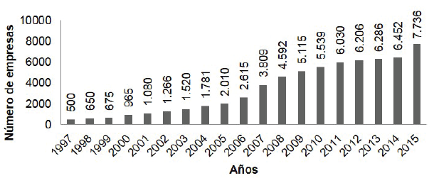Al igual que la variable anterior, se presenta un incremento permanente en el número de empresas ubicadas dentro de los PCTs a lo largo del periodo observado, manteniéndose durante los años de la crisis (Gráfico 2). Se resalta además que de este número de empresas, se dispone de información para los últimos cinco años (2010, 2011, 2012, 2013, 2014 y 2015) que refleja la existencia de un número importante de empresas incubadas (783, 931, 890, 806, 918 y 974, respectivamente) al interior de estos parques (APTE, 2015).