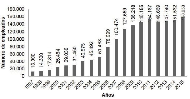 También el número de empleados contratados al interior de los PCTs ha crecido. No obstante, se debe resaltar que durante los años de la crisis y de aumento del paro, el número de trabajadores se ha mantenido más bien constante (Gráfico 3) y que según cifras estadísticas registradas en la APTE (2015) de los 158.950 empleados contratados en estos parques al final del año 2015, 31.243 se dedicaron al empleo específico en I+D que es lo que caracteriza la actividad que se desarrolla en estos parques.