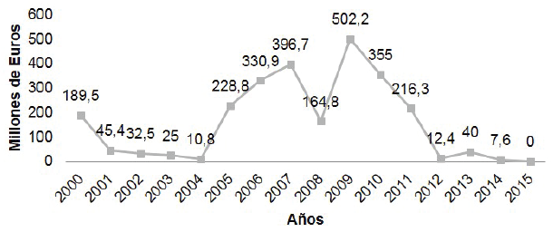Para seguir profundizando en el análisis del comportamiento de los PCTs, el Gráfico 5 muestra la evolución de las ayudas económicas otorgadas en PCTs a nivel nacional durante los años 2000 al 2015. Se observa un comportamiento heterogéneo, que evidencia la disposición de recursos a pesar de tener un detrimento en los años 2004, 2008 y 2012 que muestra que en el último periodo se pudieron ver reducidas como producto de la recesión económica.