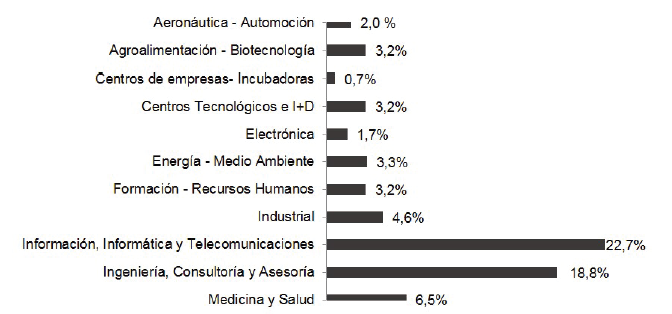Por último, se halla que las 7.736 empresas al año 2015 los sectores que agrupan un mayor número de empresas son Información, Informática y Telecomunicaciones (22,7%), Ingeniería, Consultoría y Asesoría (18,8%) y Medicina y Salud (6,5%) (Gráfico 6).