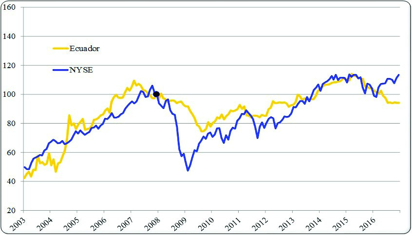 El análisis de la tendencia evolutiva de los índices bursátiles, para el caso de Ecuador, se realiza con la comparación de su índice del mercado de valores con los índices de otros países productores y no productores de petróleo. El Gráfico 1 muestra la evolución entre el índice bursátil de Ecuador con el índice bursátil de New York, catalogado como uno de los índices de referencia internacional.