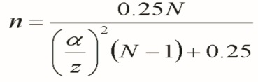 ‒ N es el tamaño de la población. ‒ Alfa es el valor del error tipo 1. El valor para el error alfa es del 5 % (0.05). ‒ El valor de z es de 1.96; este valor corresponde al número de unidades de desviación estándar para una prueba de dos colas con una zona de rechazo igual alfa. ‒ 0.25 es el valor de p2 que produce el máximo valor de error estándar, esto es p = 0.5. ‒ n es el tamaño de la muestra y el nivel de confianza es del 95 % (0.95).