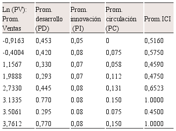 Autores con base en Calle-Medrano (2013) ajustado de Yoguel & Boscherini (1996). Las ponderaciones de los factores del ICI, fueron evaluadas por tres expertos en relación con la valoración y la encontraron adecuada.Determinada la existencia de la relación entre el ICI (innovación) y las ventas (competitividad), se dará tratamiento a los datos para procesarlos en una forma translogarítmica. Su forma funcional general se presenta como: