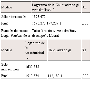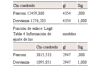 De acuerdo con la Tabla 3 y 4, la información de ajuste de los modelos indican que la significancia del modelo es menor a 0.05. (p=0.000), para ambos casos, lo que implica que el modelo es adecuado para el ajuste de los datos.