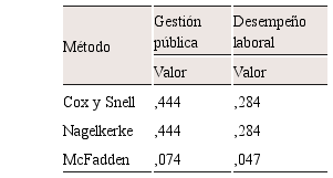 De acuerdo con la Tabla 5 el pseudo r cuadrado nos indica que el modelo está asociado con la variable dependiente con una significatividad de p = 0.000, para ambos casos y que las la fuerza de la covariables estudiadas (gestión del talento humano) permite predecir las variables dependientes (gestión pública y desempeño laboral). Así. Cox y Snell indica que el índice es de 0,444. Nagelkerke indica que el índice es de 0.444 y McFadden indica un índice de 0.074, para el caso de la gestión pública; Así. Cox y Snell indica que el índice es de 0,284. Nagelkerke indica que el índice es de 0.284 y McFadden nos indica un índice de 0.047, para el caso del desempeño laboral.